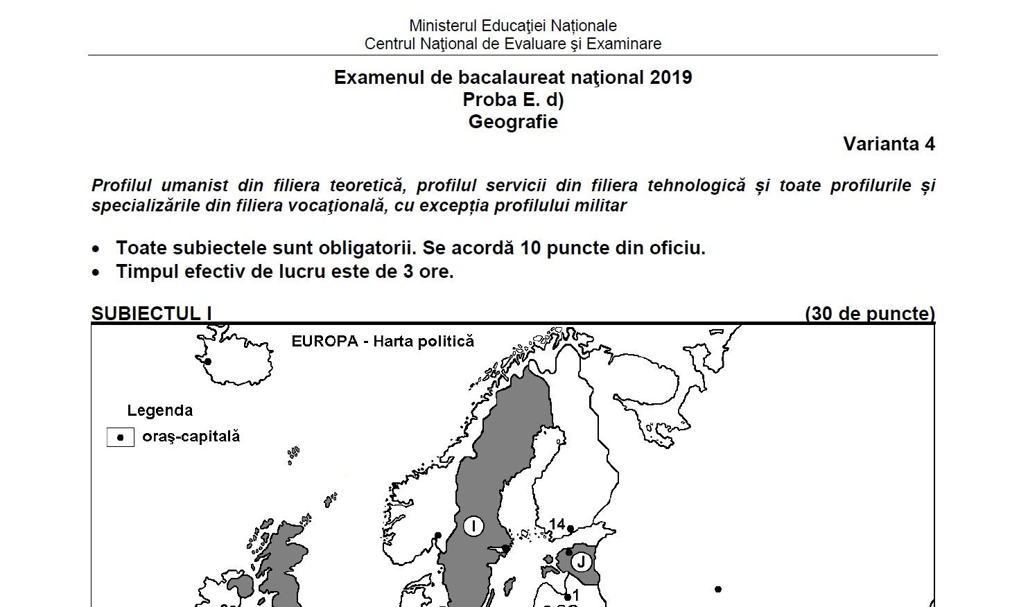 Examenul de bacalaureat 2020 se termină azi, 25 iunie, cu ultima probă, cea la alegere a profilului. Afişarea primelor rezultate este prevăzută pentru data de 12 iulie (până la ora 16.00). Subiecte și bareme bac 2020 pentru toate probele scrise: Varianta 16 varianta 17 varianta 18 varianta 19 varianta 20. Biologie, anatomie, chimie organica sau anorganica, fizica, geografie, informatica, psihologie, economie, logica, sociologie sau filosofie. E b limba şi literatura maternă Primul subiect la bac geografie 2021 este. Vedeți aici ce subiecte au picat în 2020 la limba şi literatura română. Cauți rezolvarea completă a subiectului de bac, sesiunea iulie 2019? Deasemenea puteti gasi aici rezolvate si exercitii cu formule de calcul pentru stabilirea densitatii populatiei, bilantului natural,migratoriu, sau a diverselor suprafete. Echipa bac simplu se va concentra pe a adăuga cât mai multe variante din anii trecuți. Probă scrisă la geografie model pagina 1 din 4 examenul de bacalaureat naţional 2020 proba e. Vineri, absolventii de liceu sustin ultima proba din cadrul examenului de bacalaureat 2017: